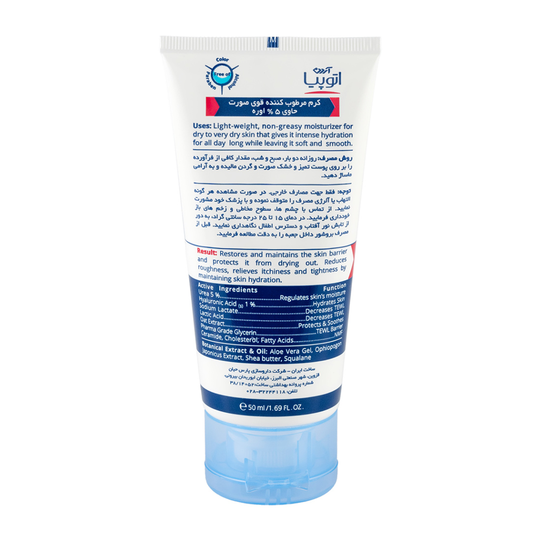 این کرم حاوی ۵ درصد اوره است که به عنوان یک مرطوب‌کننده قوی عمل کرده و رطوبت لازم را به لایه‌های عمیق پوست می‌رساند. هیالورونیک اسید موجود در آن نیز به حفظ آب در پوست کمک کرده و باعث افزایش انعطاف‌پذیری و نرمی پوست می‌شود.