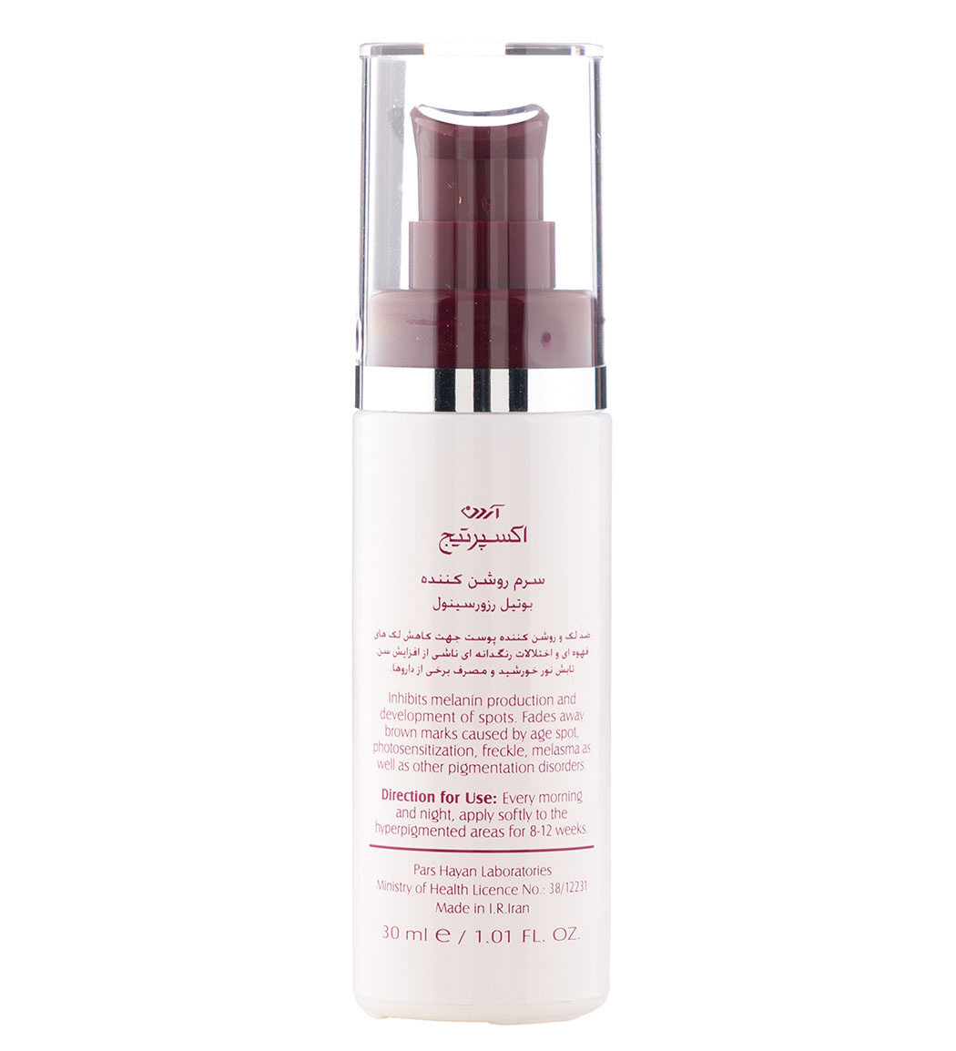 یکی از مهم‌ترین ویژگی‌های این سرم وجود ترکیب فعال بوتیل رزورسینول است که نقش کلیدی در مهار و کاهش لک‌های پوستی ایفا می‌کند. این ماده موثر به طور ویژه بر لک‌های قهوه‌ای رنگ که در نواحی صورت، گردن، سینه و بدن ظاهر می‌شوند، تاثیر گذاشته و با نفوذ عمیق به لایه‌های پوست، فرآیند روشن‌سازی را تسریع می‌بخشد. علاوه بر این، سرم روشن‌کننده اکسپرتیج آردن با خاصیت ضدلک قوی، به کاهش تیرگی‌ها و لکه‌های ناشی از عوامل مختلف محیطی و درونی کمک می‌کند.