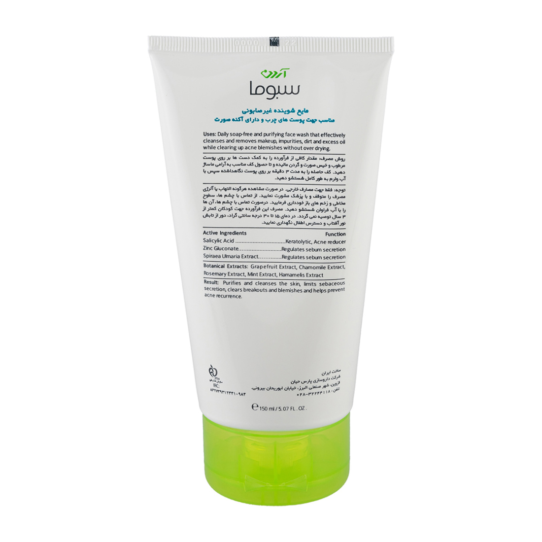 مشخصات فنی ژل شستشوی صورت آردن سبوما