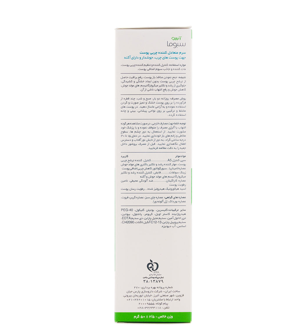 ترکیبات کلیدی سرم کنترل چربی: سپی کنترل A5، عصاره لامیناریا، اسید هیالورونیک هیدرولیز شده و زینک سولفات