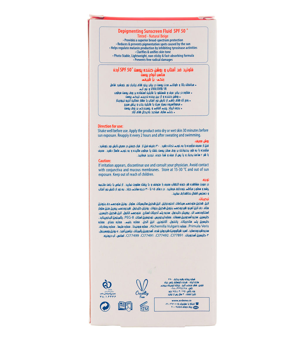 نقاط قوتاین محصول با تکنولوژی پیشرفته‌ای که دارد، بهترین تجربه را برای شما فراهم می‌کند. فلوئید ضد آفتاب رنگی آردن با بافت بسیار سبک و پوشش یکنواخت، مناسب انواع پوست بوده و به خوبی از ایجاد لک و چین و چروک جلوگیری می‌کند. استفاده روزانه این کرم باعث حفظ رطوبت پوست و جلوگیری از خشکی آن می‌شود. محافظت 98 درصدی در برابر پرتوهای مضر آفتاب، اطمینان خاطر برای مراقبت از پوست فراهم می‌آورد. برای بهترین نتیجه، توصیه می‌شود ۳۰ دقیقه پیش از قرار گرفتن در معرض نور خورشید استفاده و هر دو ساعت تمدید شود. این محصول انتخابی ایده‌آل برای داشتن پوستی سالم و درخشان است.