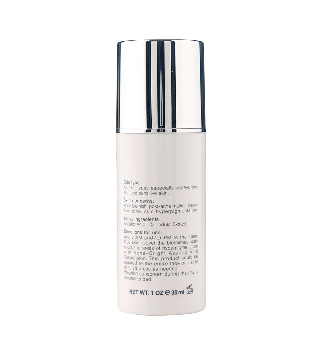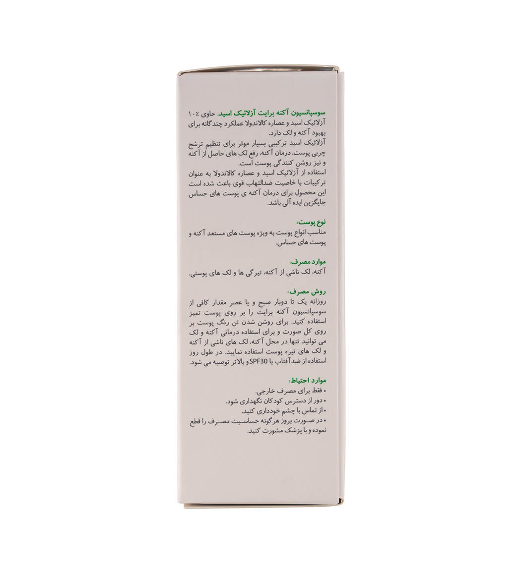 نوع محصول: ضد لک و ضد آکنه با ماهیت سوسپانسیون  مناسب برای: انواع پوست، بزرگسالان، خانم‌ها و آقایان  حجم: 30 میلی‌لیتر  ترکیبات موثر: آزلائیک اسید 10 درصد، عصاره کالاندولا  ویژگی‌های اضافی: درمان چین و چروک، کنترل چربی پوست، پاکسازی عمیق منافذ پوست  محفظه نگهدارنده: پمپی  فاقد پارابن  برند: برایت مکس  کشور سازنده: ایران (شرکت فرا آرا گستر)