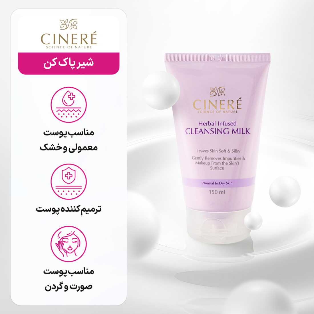 ویژگیهای کلیدی شیر پاک کن پوست معمولی و خشک سینره