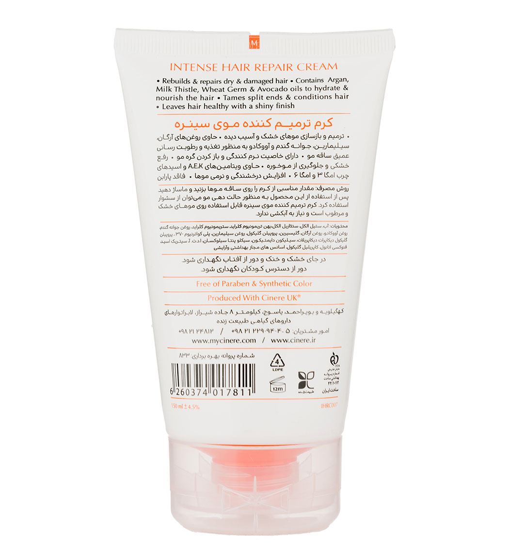 کرم ترمیم کننده مو سینره مدل فاقد پارابن حجم 150 میلی لیترcinere intense hair repair cream