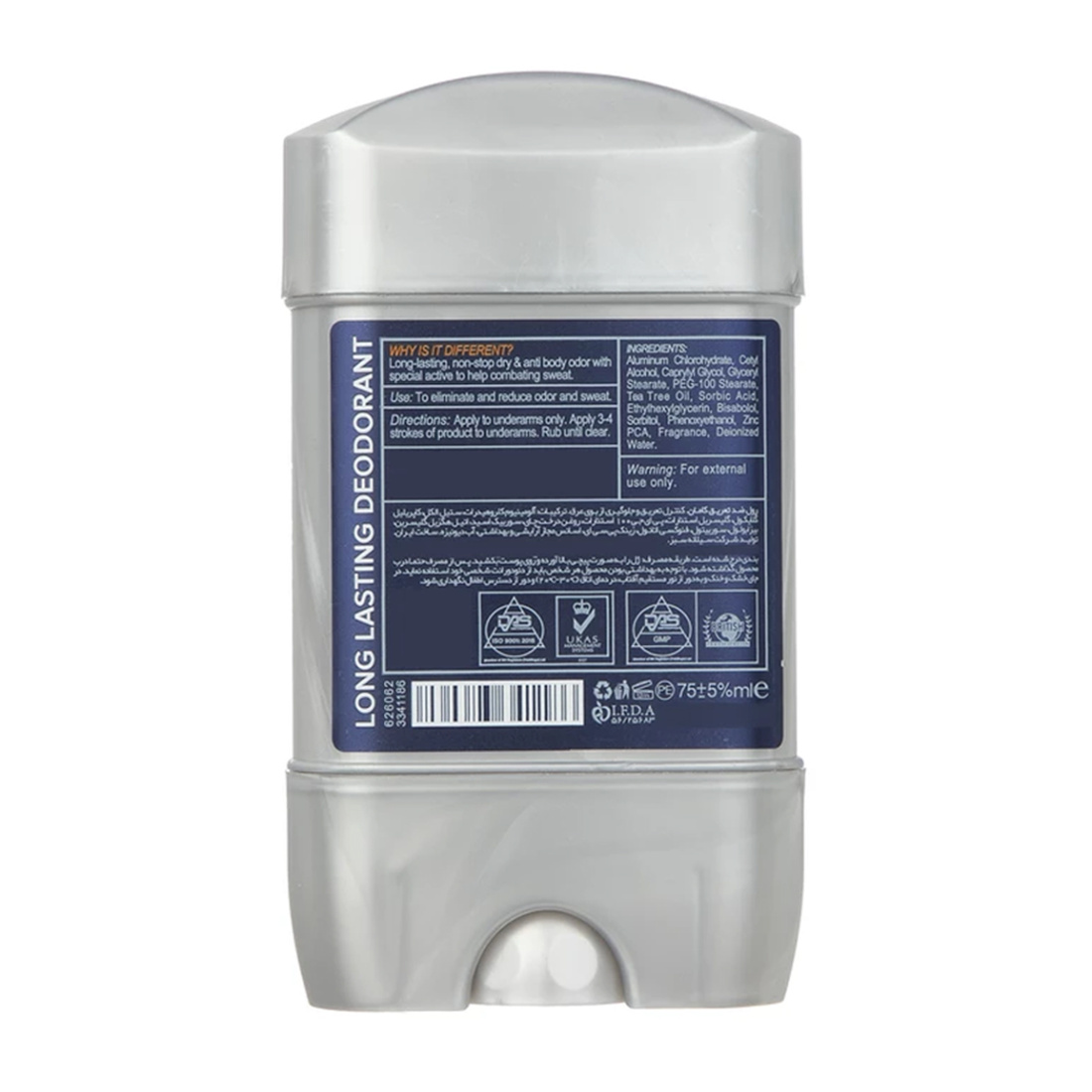 ترکیبات موثر: روغن درخت چای، آلومینیوم کلروهیدرات، بیزابولول، ستیل الکل، کاپریلیل گلایکول، گلیسریل استئارات، پی ای جی 100 استئارات، سوربیک اسید، اتیل هگزیل گلیسرین، سوربیتول، فنوکسی اتانول، زینک پی سی آی، تری کلوزان و اسانس مجاز آرایشی بهداشتی.
