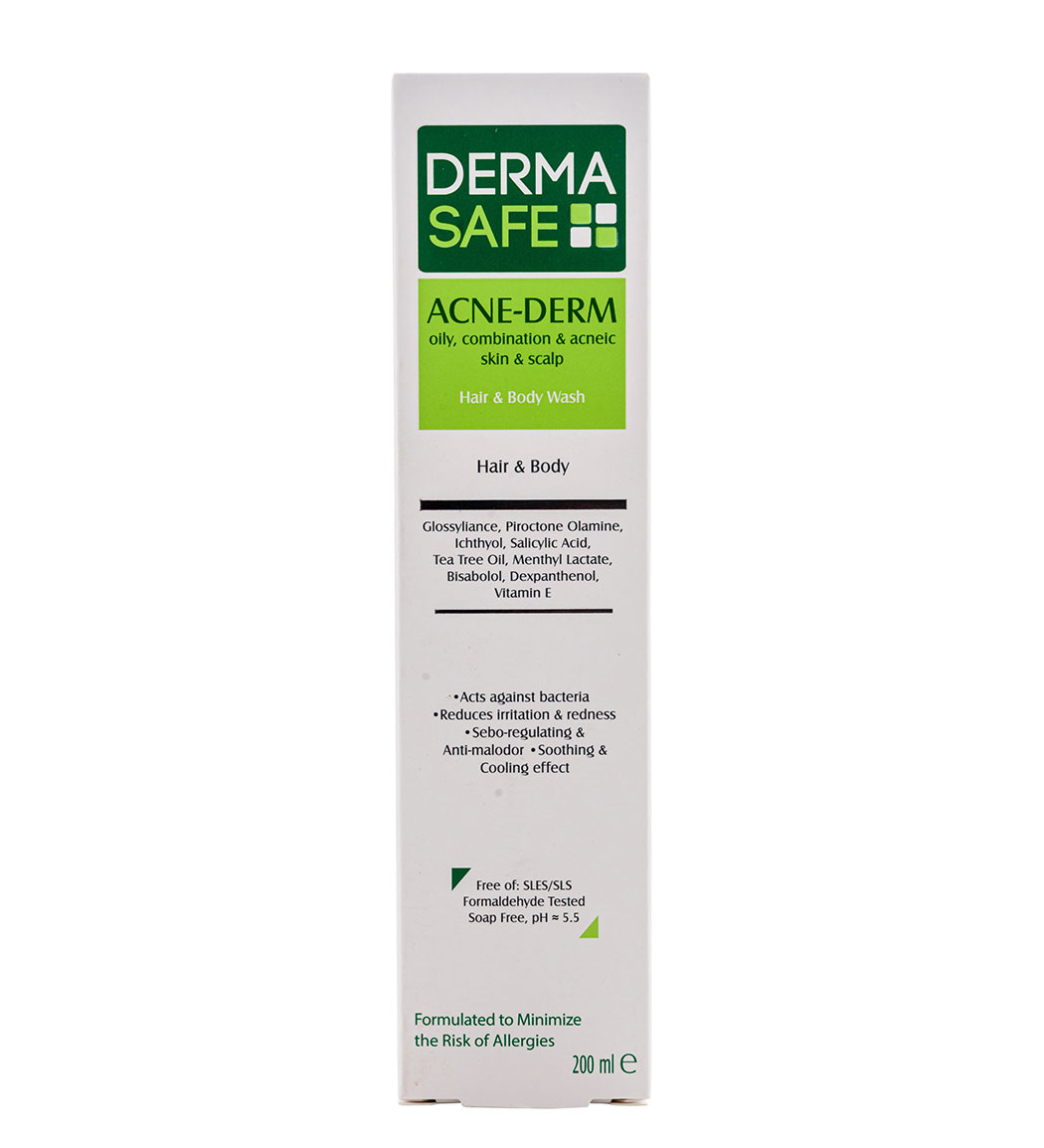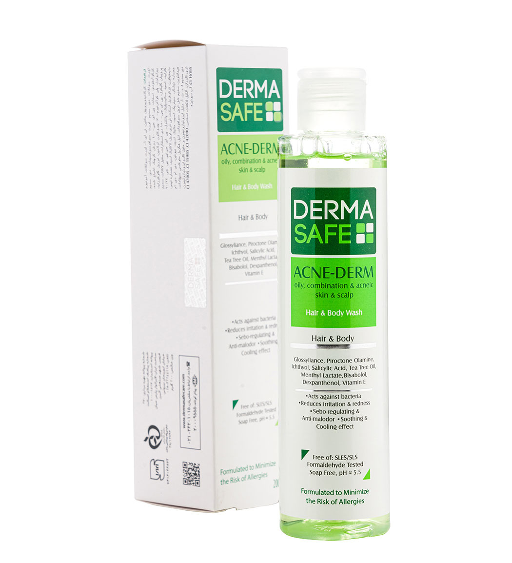 شامپو سر و بدن مناسب پوست های چرب مختلط و دارای آکنه 200میل درما سیفDerma Safe Hair And Body Wash 200ml