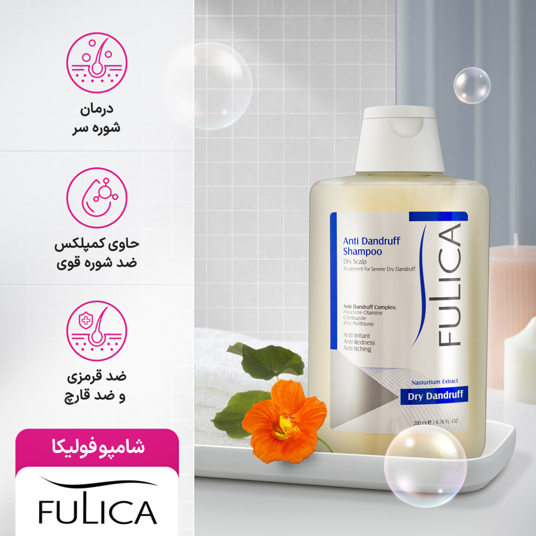 شامپو ضد شوره مناسب شوره و پوست سر خشک فولیکا حجم 200میلی لیترfulica anti dandruff shampoo