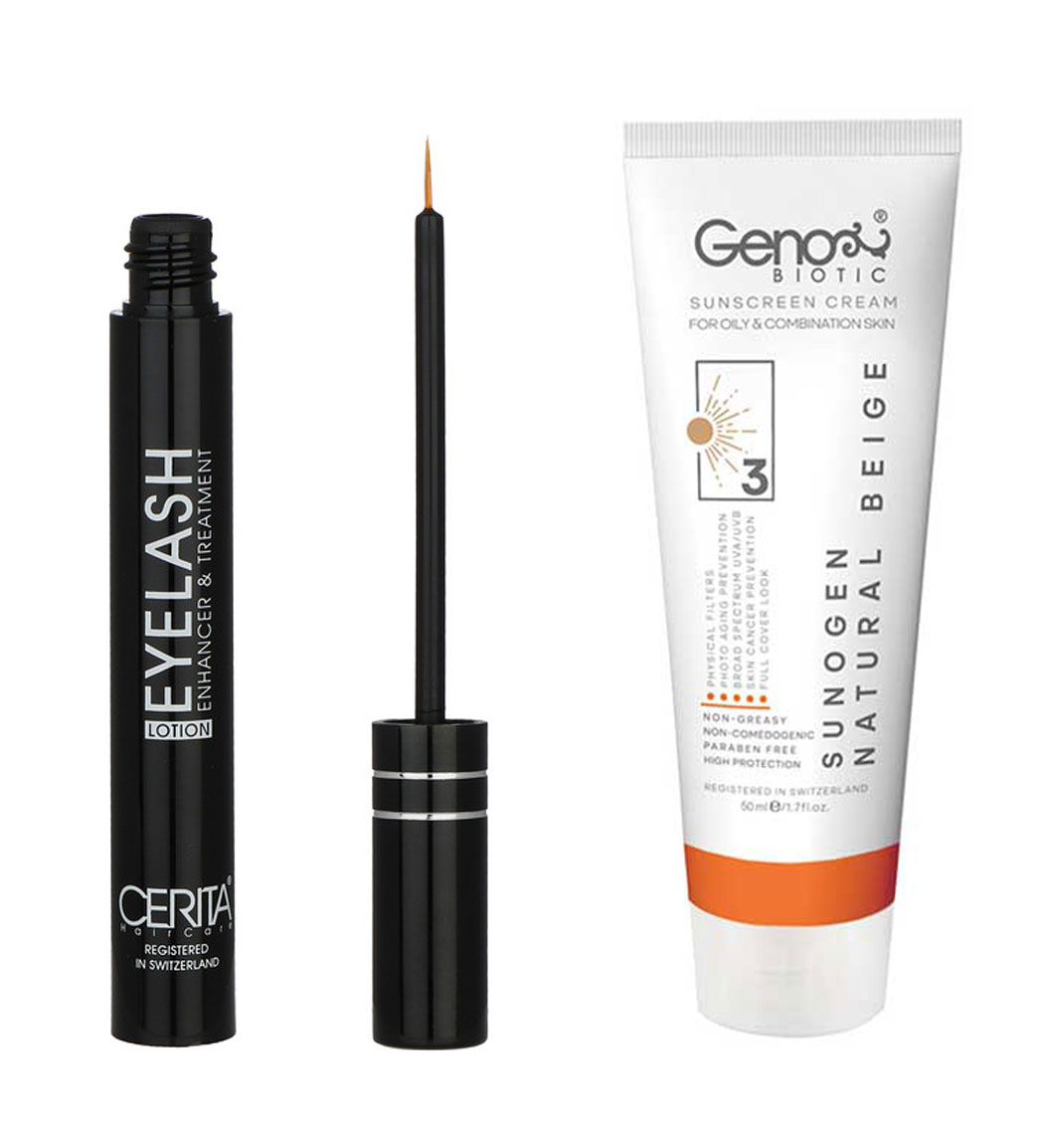 پک تخصصی محلول تقویتکننده مژه سریتا و کرم ضد آفتاب رنگی SPF50 مناسب پوست چرب و مختلط ژنو بایوتیک
