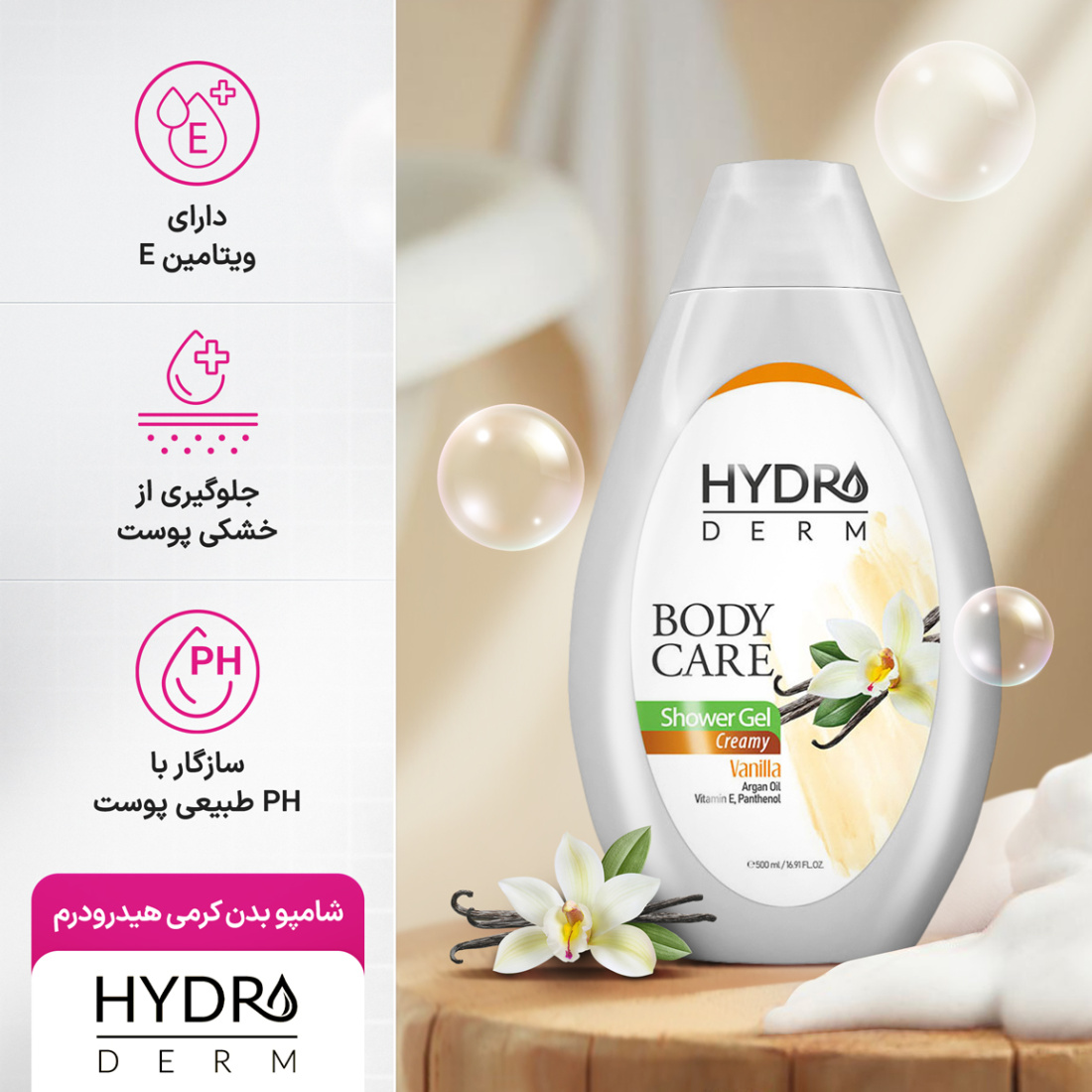 شامپو بدن کرمی هیدرودرم با رایحه وانیل و روغن آرگان حجم 500 میلی لیترHydroderm Creamy Body Wash Vanilla And Argan Oil 500 ml