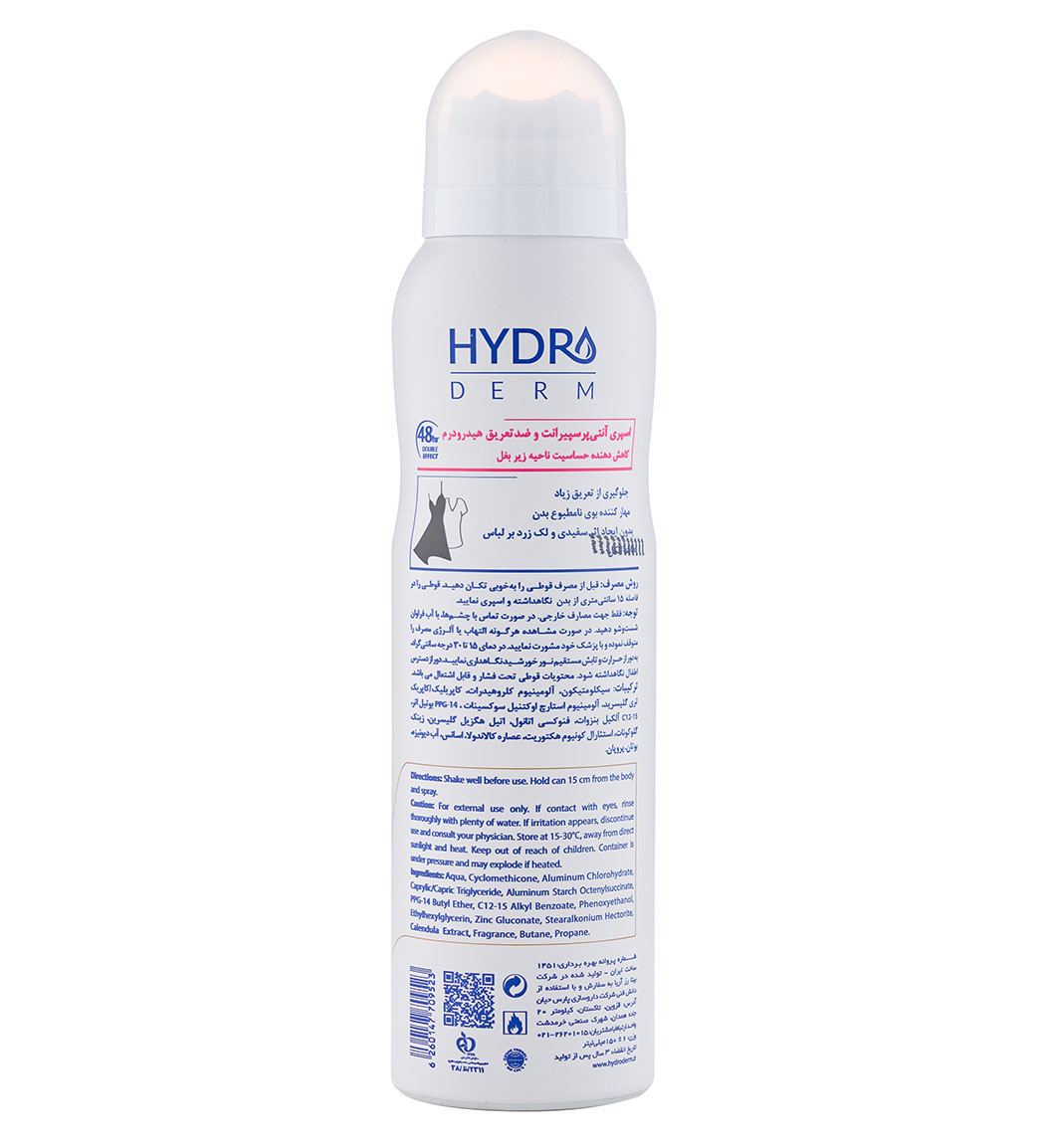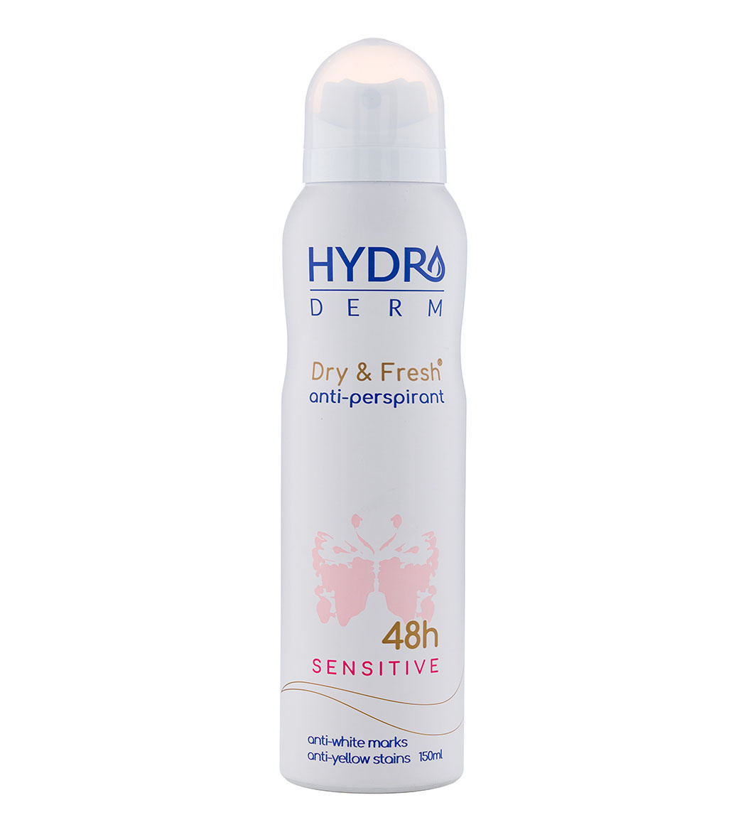 اسپری دئودورانت و ضد تعریق بانوان هیدرودرم مدل Sensitive مناسب پوست‌های حساس با ماندگاری بیش از ۴۸ ساعت و حجم ۱۵۰ میلی‌لیتر