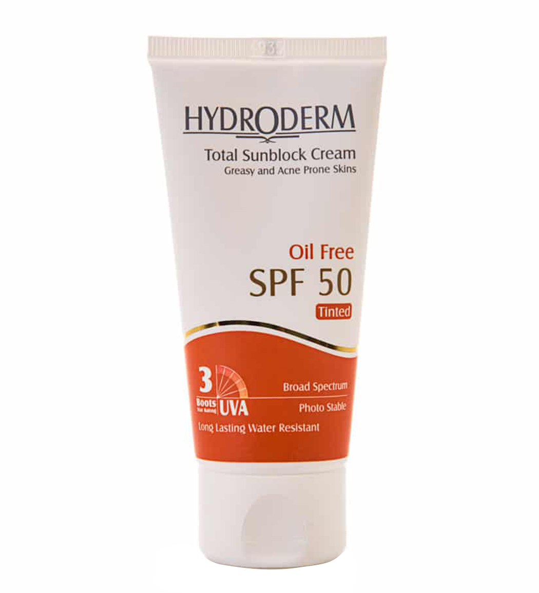 کرم ضد آفتاب رنگی هیدرودرم با SPF50 مناسب انواع پوست حجم 50 میلی لیترhydroderm spf 50 tinted oil free total sunblock cream