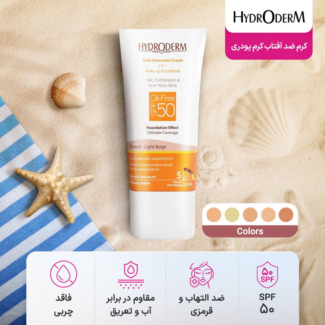 مشخصات کلیhydroderm spf 50 tinted oil free total suncream 2x1 makeup sunblock