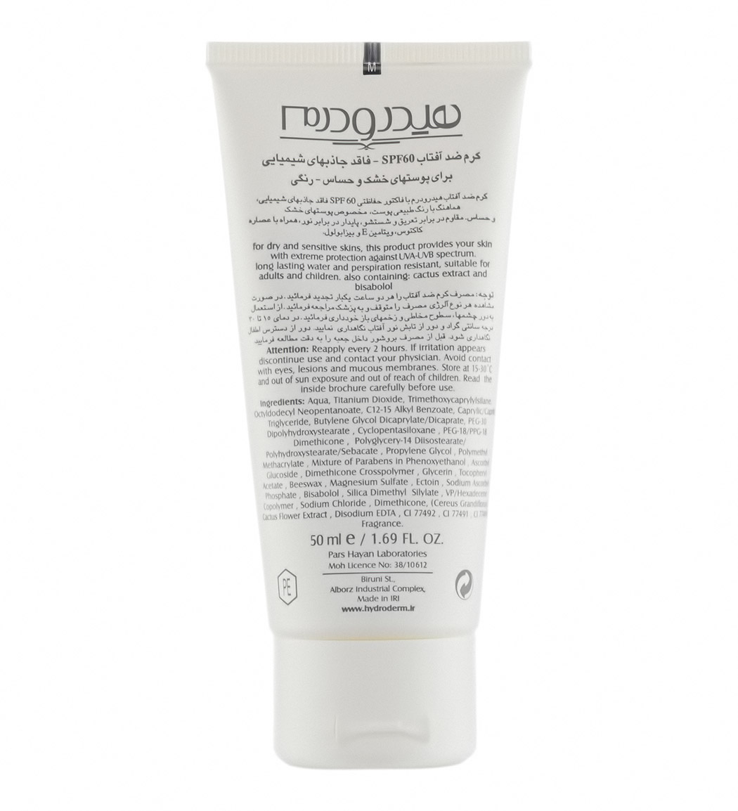 کرم ضد آفتاب هیدرودرم با SPF60، محافظتی گسترده و قوی در برابر هر دو نوع پرتو UVA و UVB ارائه می‌دهد. این محصول فاقد ترکیبات جاذب شیمیایی است و به همین دلیل برای افرادی که پوست حساس دارند، بارداران و کودکان بسیار مناسب است. ترکیبات اصلی این ضد آفتاب شامل اکسید روی و دی‌اکسید تیتانیوم است که به عنوان فیلترهای فیزیکی عمل کرده و از پوست در برابر آسیب‌های ناشی از نور خورشید محافظت می‌کنند.