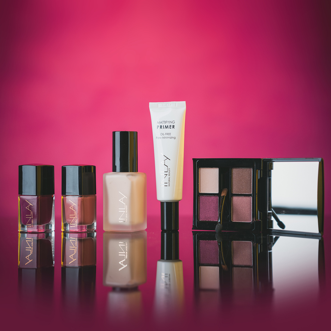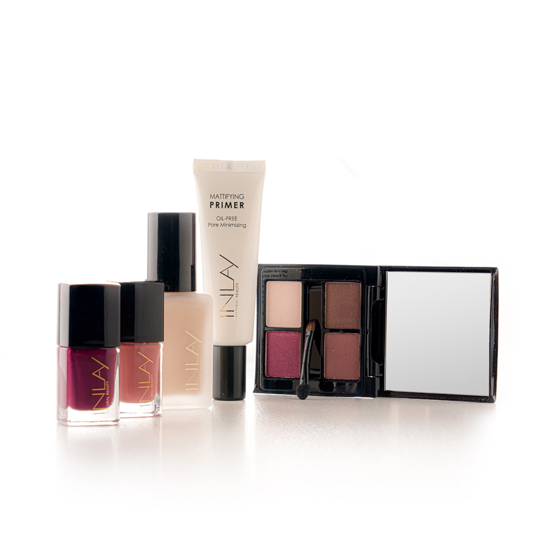 پک کامل آرایش شامل پالت سایه چشم، لاک ناخن، پرایمر و کرم پودر مات کننده این لی
