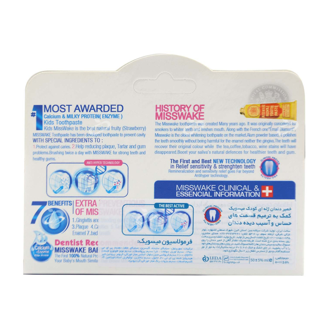 نقاط قوتاین محصول با کیفیت عالی، راحتی و کارایی را در کنار هم به شما ارائه می‌دهد. فرمول آن شامل ترکیباتی مانند کلسیم و پروتئین شیر است که به ترمیم دندان‌های آسیب دیده کمک می‌کند و از دندان‌های شیری محافظت می‌کند. طعم توت فرنگی دلپذیر آن باعث می‌شود کودکان به راحتی از خمیر دندان استفاده کنند. این محصول مناسب کودکان بالای دو سال بوده و در بسته‌بندی تیوپی ۵۰ میلی‌لیتری عرضه می‌شود. تولید ایران با استانداردهای تحت لیسانس سوئیس کیفیتی مطمئن را تضمین می‌کند. استفاده مداوم از این خمیر دندان به حفظ سلامت دهان و دندان کودکان کمک شایانی می‌کند.