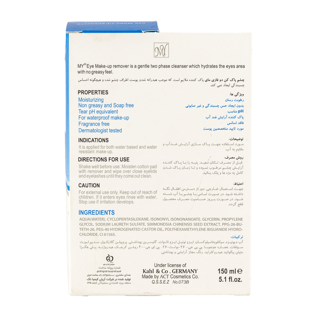 مشخصات فنی و ترکیبات موثر پاک کننده آرایش چشم دو فاز مای