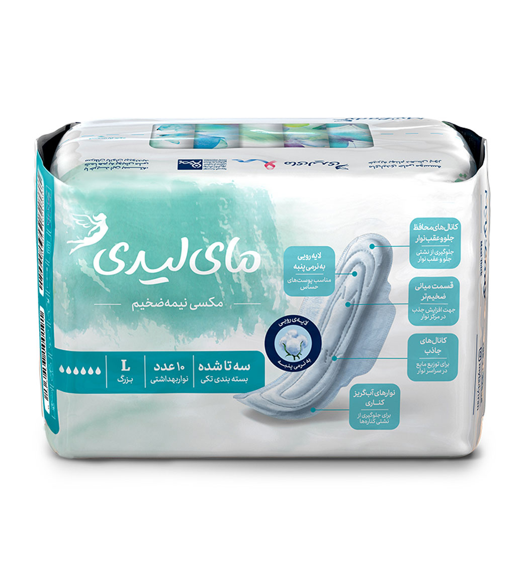نقاط قوتاین محصول با کیفیت عالی، راحتی و کارایی را در کنار هم به شما ارائه می‌دهد. نوار بهداشتی مای‌لیدی نیمه ضخیم با سایز بزرگ طراحی شده تا از نشت ترشحات جلوگیری کند و احساس خشکی طولانی‌مدت را فراهم آورد. وجود پودر جاذب و کانال‌های جذب در جلو و عقب، قدرت جذب فوق‌العاده‌ای به این محصول می‌بخشد و از بازگشت رطوبت به لباس جلوگیری می‌کند. باله‌های انعطاف‌پذیر آن به خوبی روی لباس زیر فیکس شده و حرکت نمی‌کند، بنابراین امنیت و آرامش را در طول روز تضمین می‌کند. لایه بیرونی نرم و مشبک این نوار بهداشتی از بروز حساسیت و تحریکات پوستی جلوگیری کرده و برای پوست‌های حساس بسیار مناسب است. بسته‌بندی سه‌تایی و جداگانه آن، استفاده و حمل را آسان می‌کند و انتخابی ایده‌آل برای مصرف روزانه و طولانی‌مدت به شمار می‌رود.