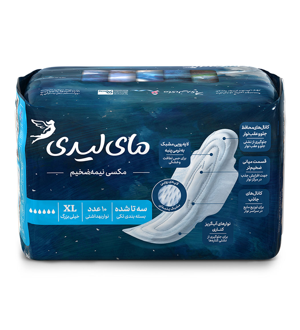 نوار بهداشتی مکسی نیمه ضخیم بالدار سایز خیلی بزرگ مای‌لیدی مناسب استفاده شبانه با جذب بالا و پوشش کامل.
