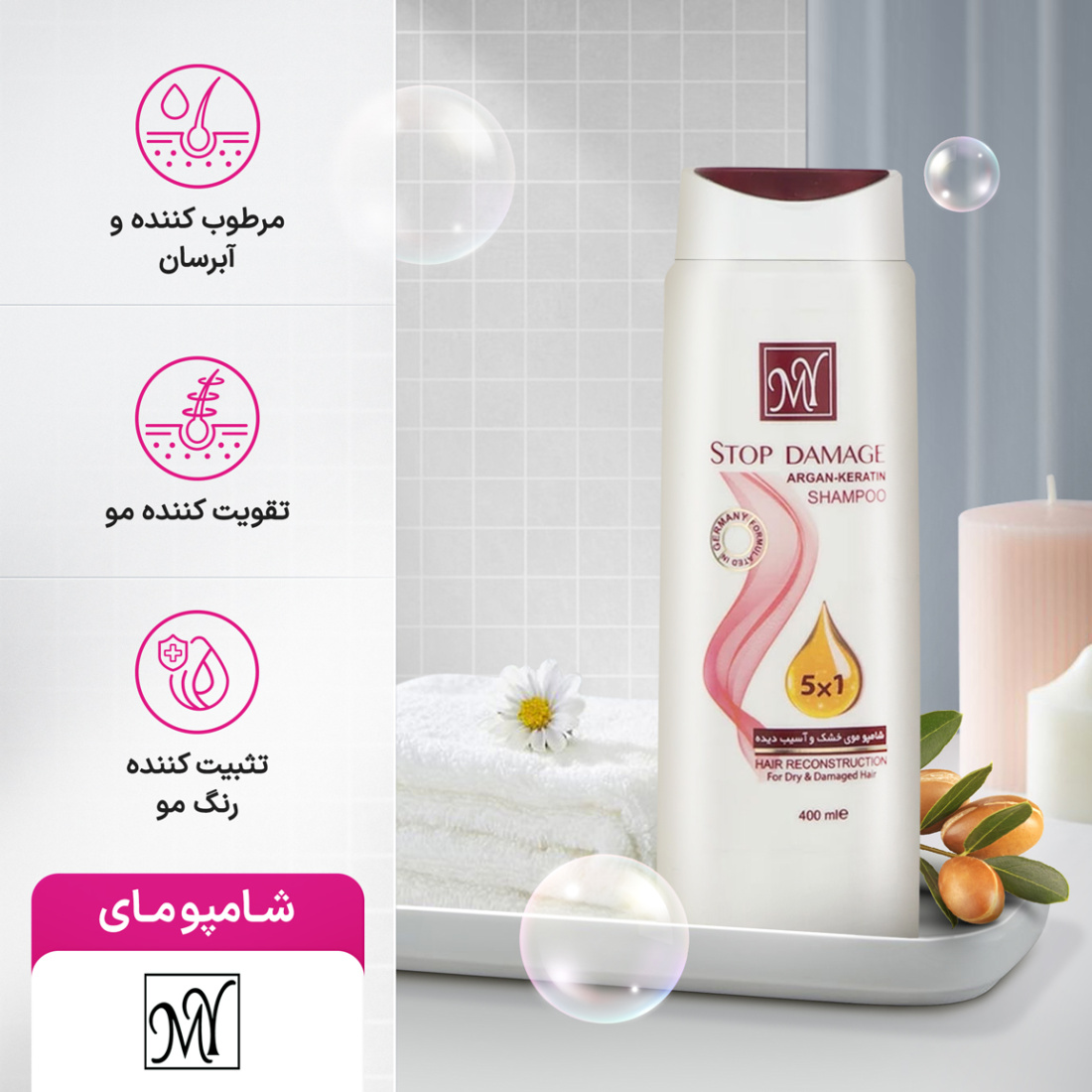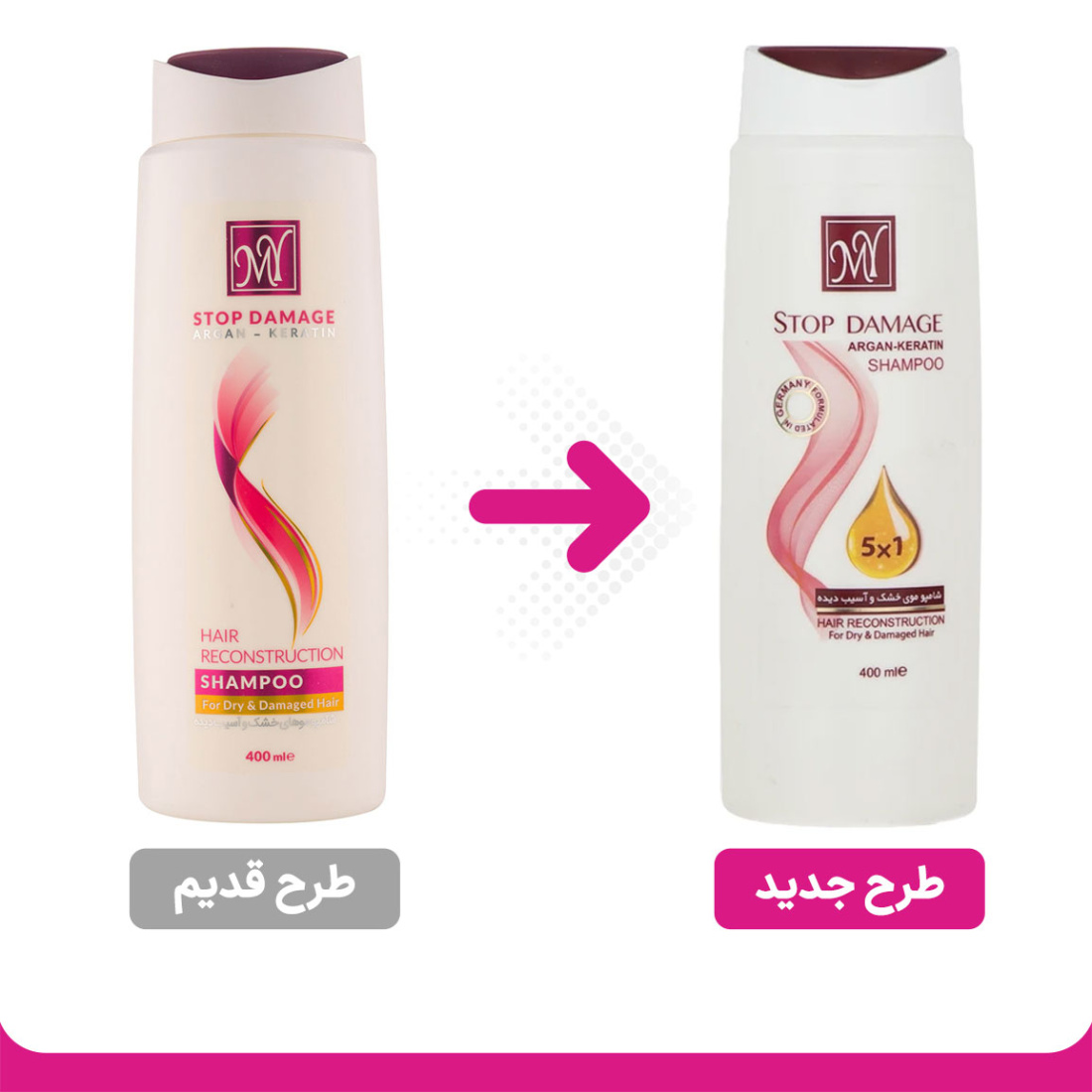 شامپو استاپ دمیج مای با فرمولاسیونی غنی از کراتین و روغن آرگان، مناسب موهای خشک، آسیب دیده و رنگ شده برای ترمیم و محافظت روزانه است.