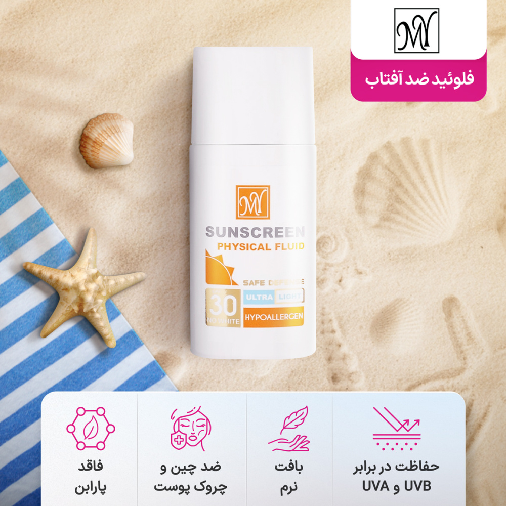 فلوئید ضد آفتاب فیزیکال SPF 30 مای با فرمولاسیون سبک و محافظت موثر از پوست در برابر اشعه‌های مضر خورشید.