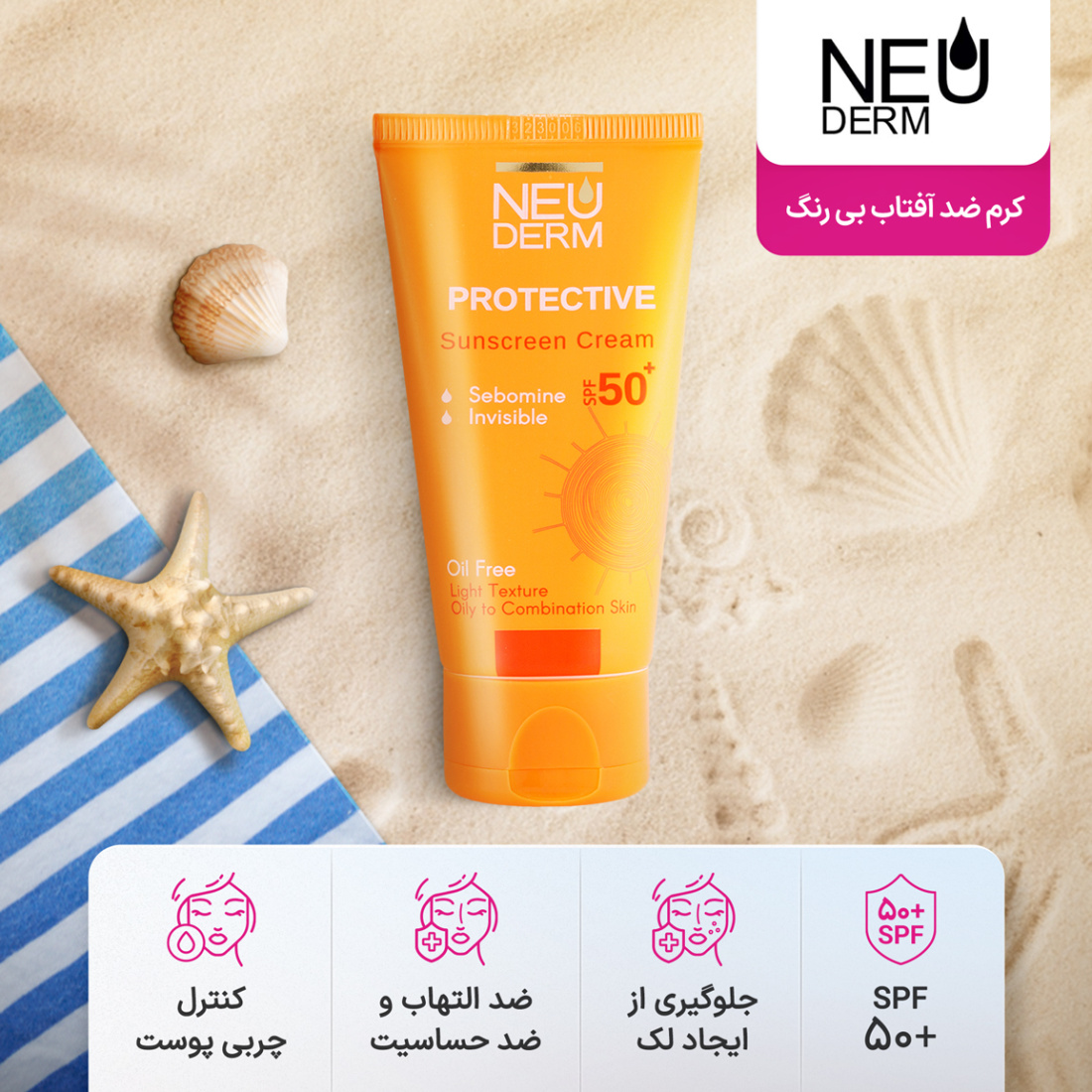 کرم ضد آفتاب بی رنگ نئودرم با SPF+50 ویژه پوست‌های چرب – محافظت کامل و مراقبت تخصصی پوست
