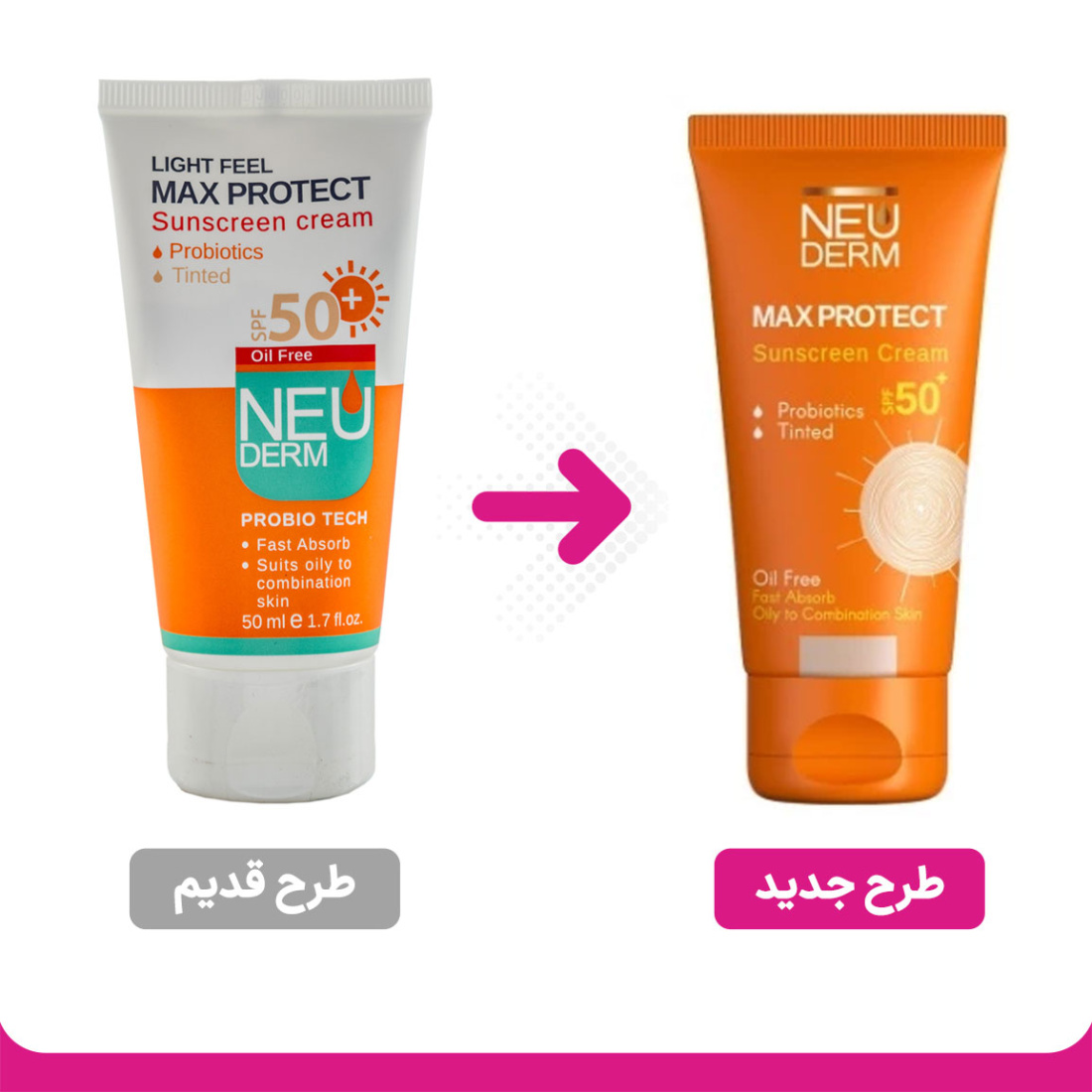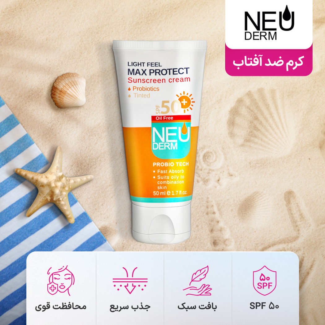 کرم ضد آفتاب مکس پروتکت فاقد چربی رنگی SPF 50 نئودرم؛ محافظت کامل و تخصصی برای پوستهای چرب و مختلط