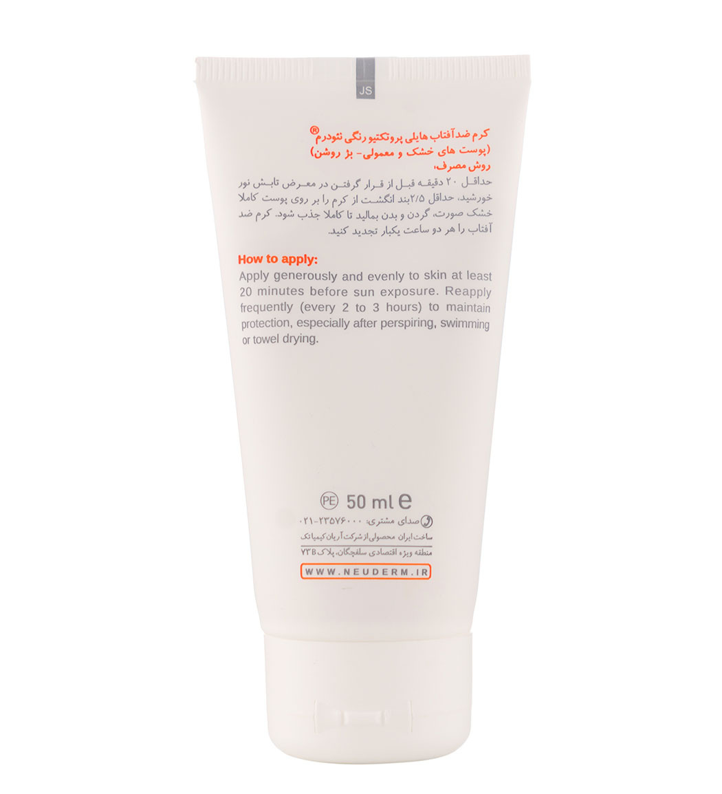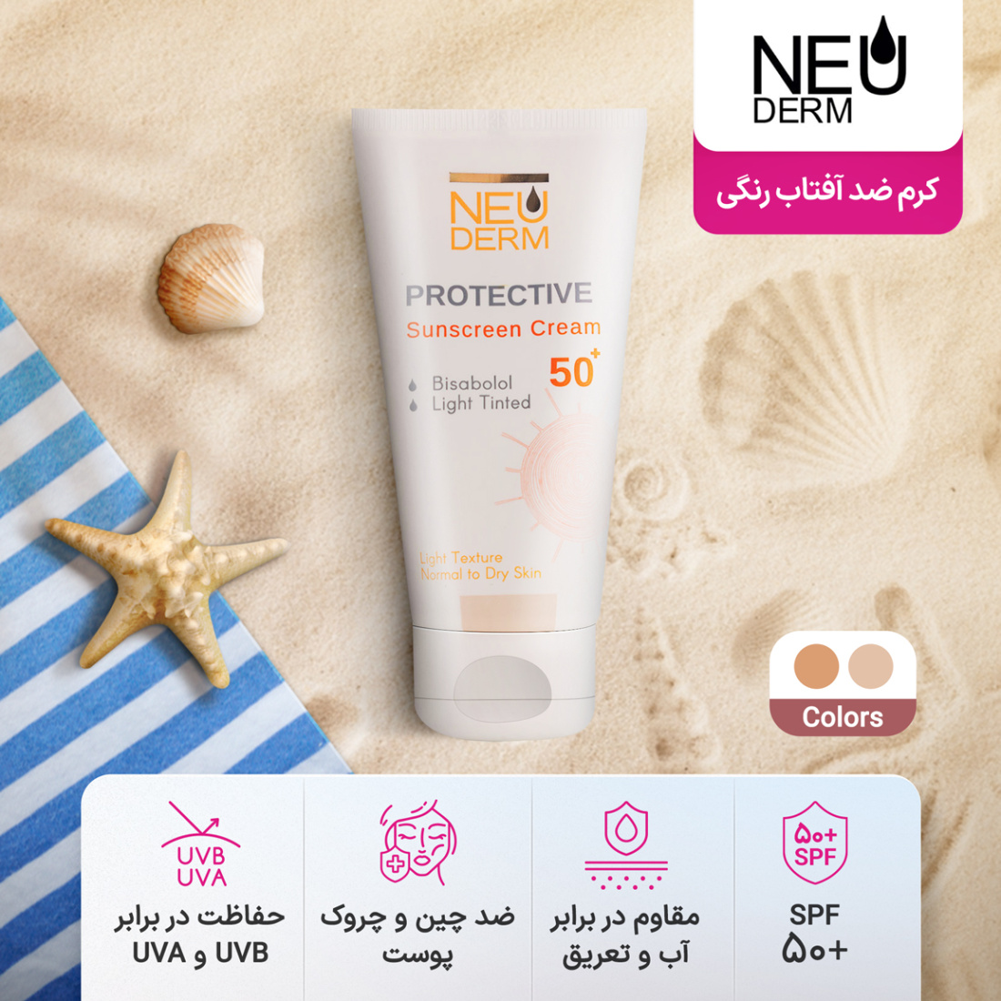 کرم ضد آفتاب رنگی نئودرم مدل Protective با SPF50 مناسب پوست نرمال و خشک حجم 50 میلی لیترNeuderm Tinted Sunscreen Cream 50ml