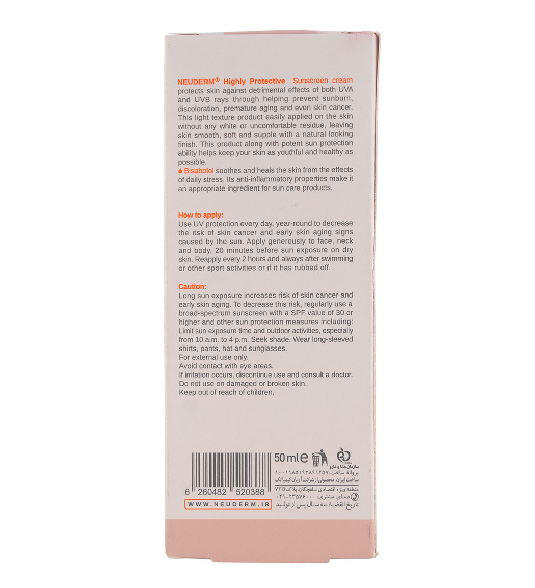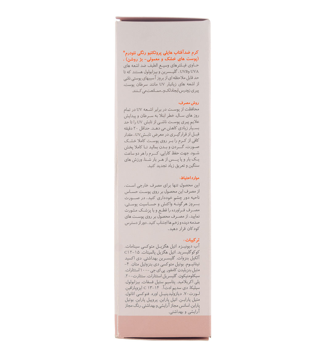 کرم ضد آفتاب رنگی نئودرم با SPF +50 به عنوان یک محصول تخصصی و چندکاره، با بهره‌گیری از فیلترهای قوی محافظتی، از پوست شما در برابر اشعه‌های UVA و UVB محافظت می‌کند و به کاهش خطرات ناشی از تابش مستقیم آفتاب مانند لک‌های پوستی، چین و چروک، آکنه و حتی سرطان پوست کمک می‌نماید. این کرم با فرمولاسیونی سبک و غیرچرب، به سرعت جذب پوست شده و احساس سنگینی یا چسبندگی ایجاد نمی‌کند، بنابراین استفاده روزانه از آن بسیار راحت و دلپذیر است.