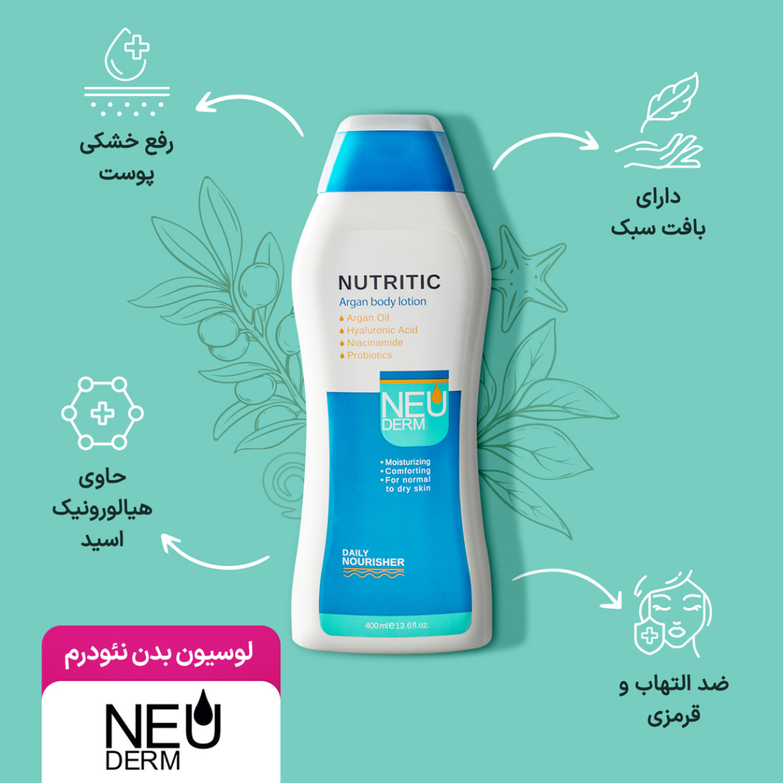 لوسیون بدن نوتریتیک آرگان نئودرم؛ مرطوبکننده قوی و تغذیهکننده پوستهای نرمال تا خشک