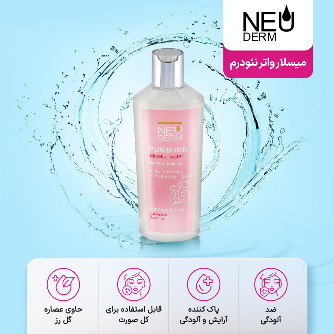 این محصول با فرمولاسیون فاقد الکل، پارابن و سولفات، کاملاً مناسب برای همه سنین و انواع پوست است. میسلار واتر نئودرم دارای ترکیبات موثر شامل عصاره گل رز و پروبیوتیک می‌باشد که به تقویت و ترمیم لایه محافظ پوست کمک می‌کند. همچنین این محصول نیازی به آبکشی ندارد و می‌تواند به‌سرعت و آسانی در برنامه مراقبت روزانه شما جای گیرد.