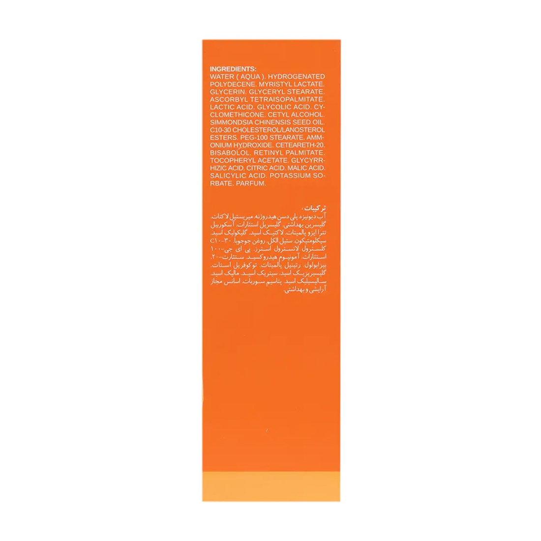 آب، پلی دسین هیدروژنه، میریستیل لاکتات، گلیسیرین، گلیسیریل ستئارات، آسکوربیل تترا ایزو پالمیتات، اسید لاکتیک، گلیکولیک اسید، سیکلومتیکون، ستیل الکل، روغن جوجوبا، C10-30 کلسترول/ لانوسترول استرس، PEG-100 استئارات، هیدروژن آمونیوم، ستئارت-20، بیزابولول، رتینل پالمیتات، توکوفریل استات (ویتامین E)، گلیسیریزیک اسید، اسید سیتریک، مالیک اسید، سالیسیلیک اسید، پتاسیم سوربات، آروما