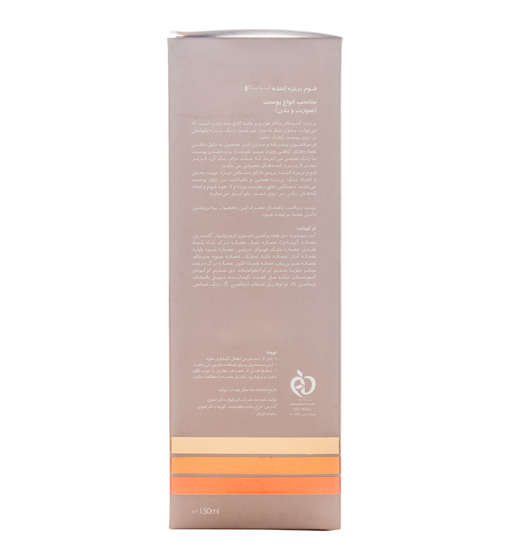 نوع محصول: فوم برنزه کننده با بافت سبک و جذب سریع  جلوه نهایی: مات و طبیعی  رنگ: متوسط و مناسب انواع پوست  مناسب برای: استفاده روی پوست بدن و صورت  پوشانندگی: متوسط و یکنواخت  رایحه: خوشبو و ملایم  مقاومت در برابر آب: ندارد، بنابراین پس از استفاده باید از تماس زیاد با آب خودداری کرد  ویتامین‌های موثر: ویتامین A و ویتامین E برای حفظ سلامت و نرمی پوست  کاربرد: مناسب استفاده روزانه با ماندگاری بالا  حجم: 120 میلی‌لیتر در بسته‌بندی پلاستیکی مقاوم  کشور سازنده: ایران  شرکت تولیدکننده: لابراتوار دکتر اخوی  لوازم همراه: دستکش مخصوص برای جلوگیری از لکه شدن دست‌ها