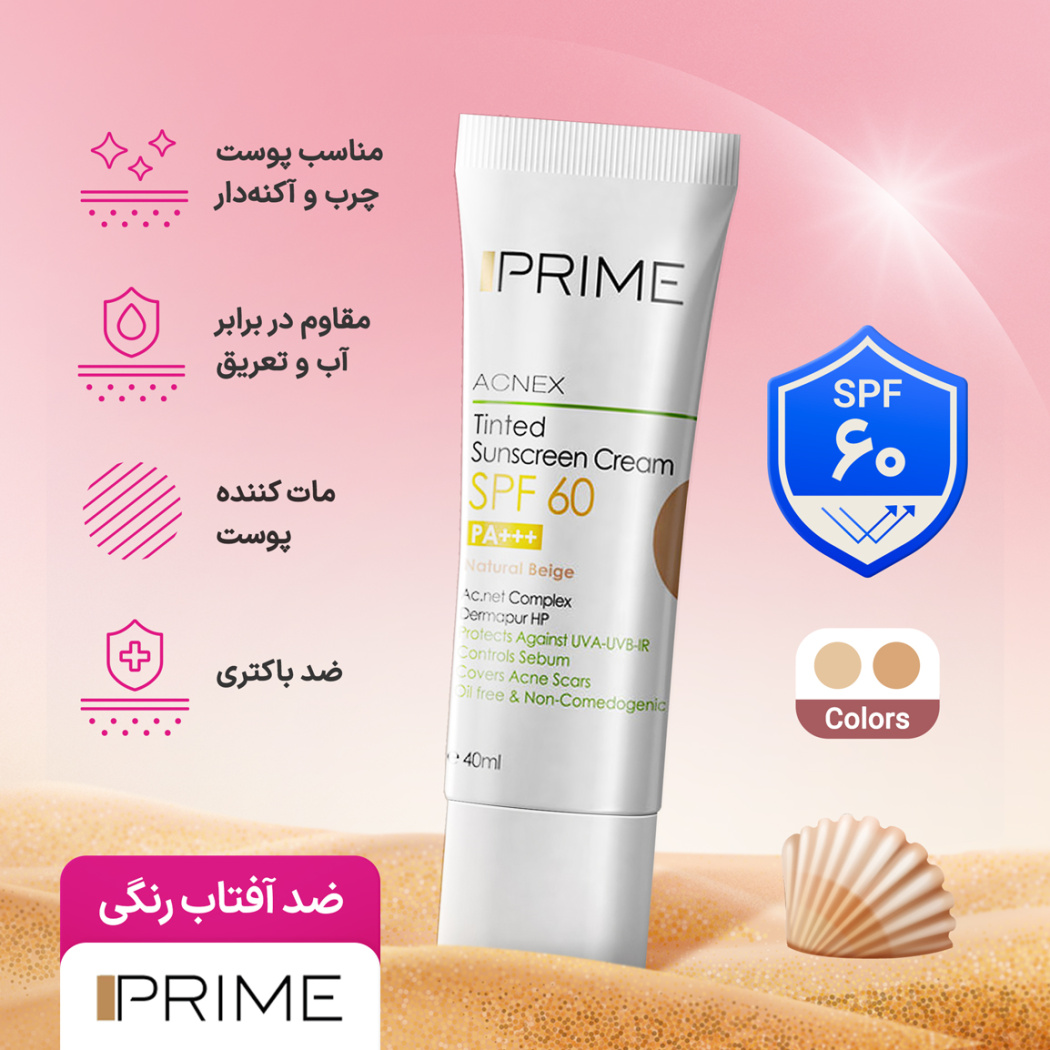 ضدآفتاب رنگی پریم با SPF 60، مناسب پوست‌های چرب و مستعد آکنه، با پوشش مات و سبک بدون چربی.