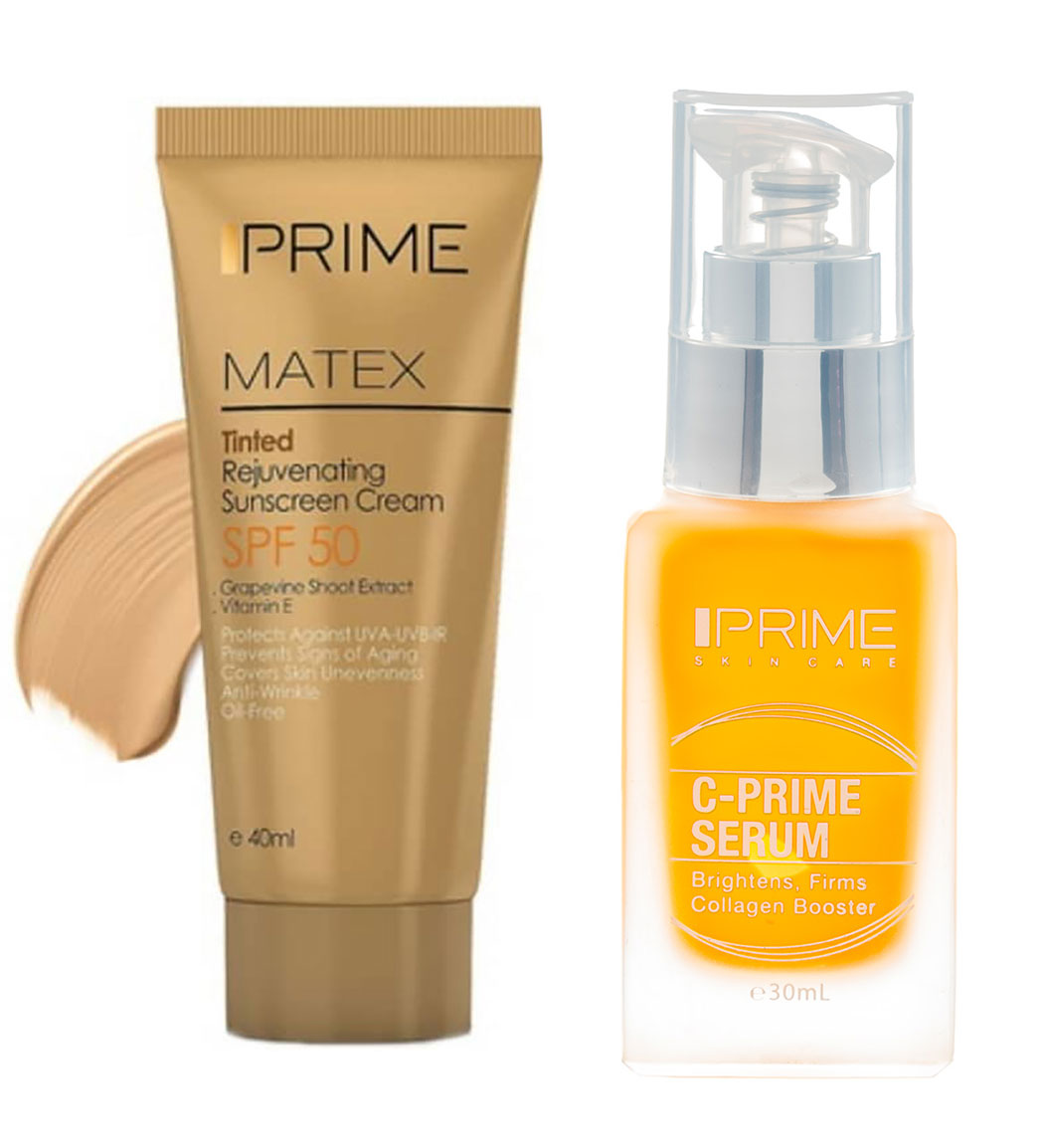 پک کرم ضد آفتاب بژ طبیعی جوان کننده اس پی اف 50 و سرم ویتامین سی پرایمPrime Tinted Rejuvenating Sunscreen Cream And Vitamin C Serum