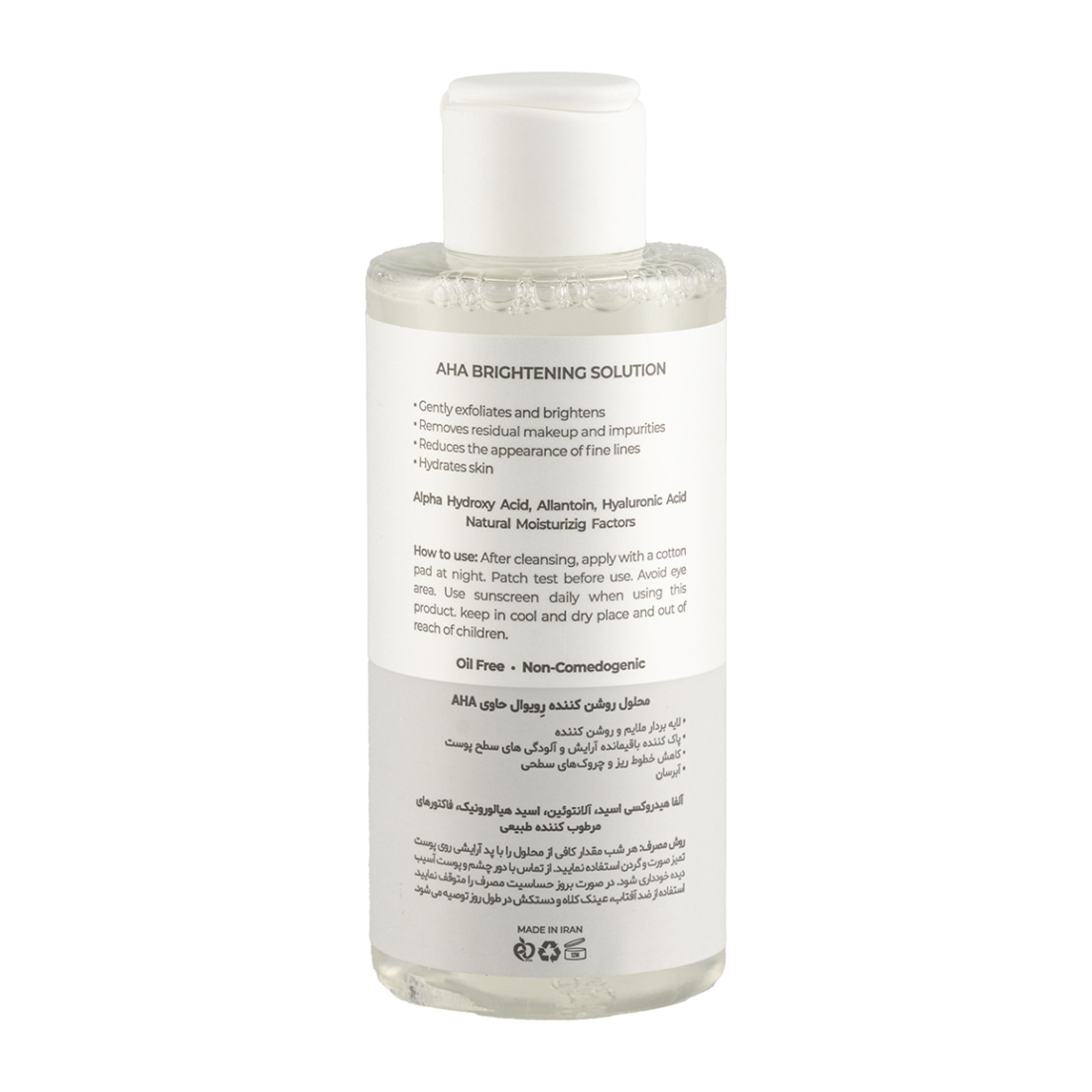 این محلول با ترکیبات فعال آلفا هیدروکسی اسید، به عنوان یک لایه‌بردار ملایم عمل کرده و سلول‌های مرده سطح پوست را به آرامی از بین می‌برد. این فرآیند باعث روشن‌تر شدن پوست، افزایش شفافیت طبیعی و بهبود بافت پوست می‌شود. همچنین استفاده منظم از این محصول موجب کاهش علائم پیری زودرس نظیر خطوط ریز و چین و چروک می‌گردد.