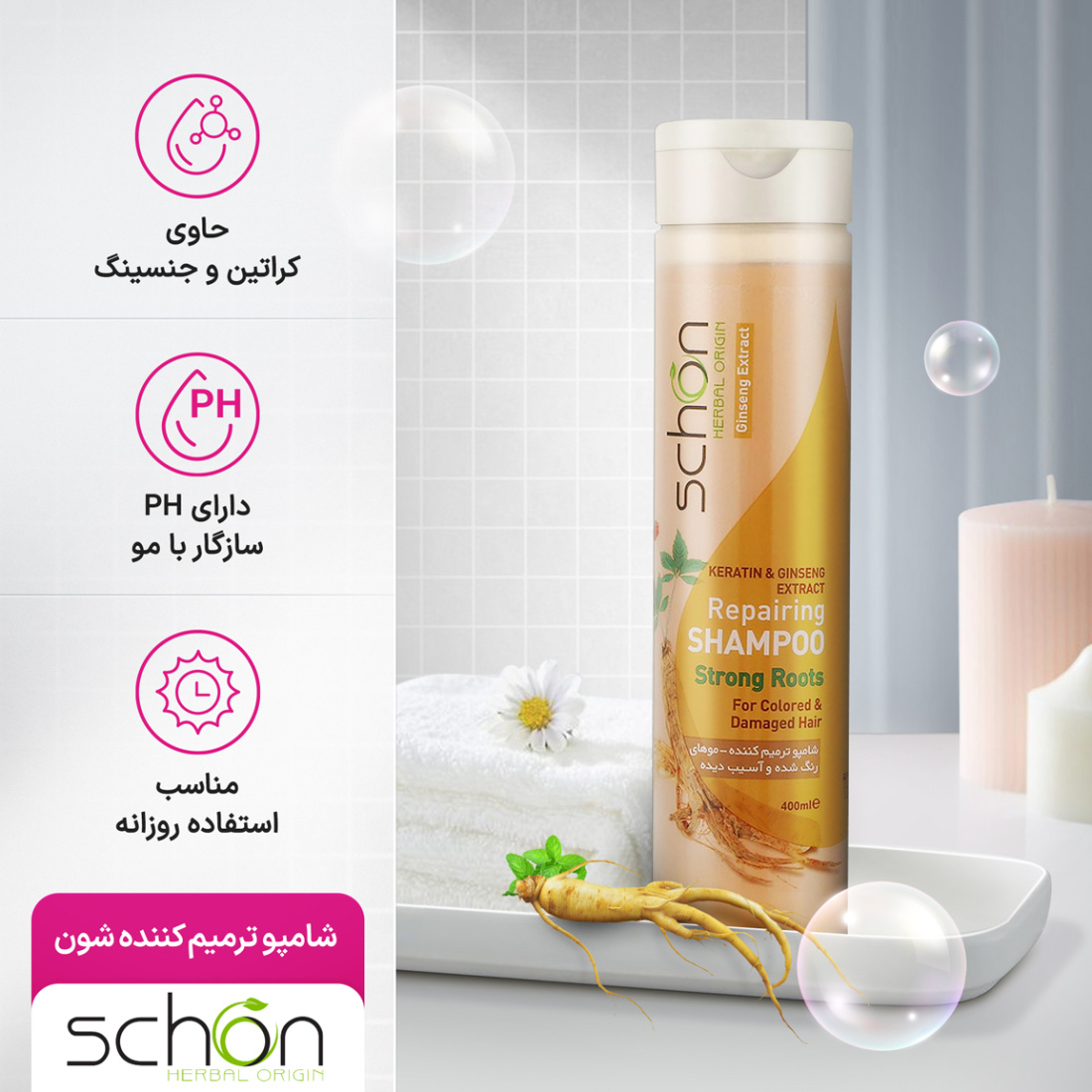 شامپو مو ترمیم کننده شون مدل کراتین و جینسینگ حجم 400 میلی لیترSchon Keratin And Ginseng Shampoo