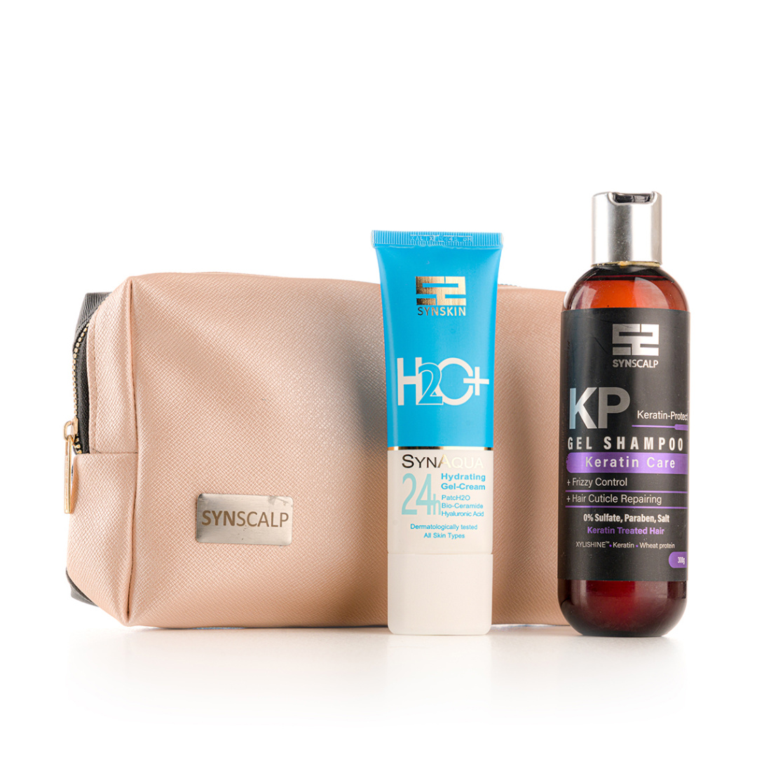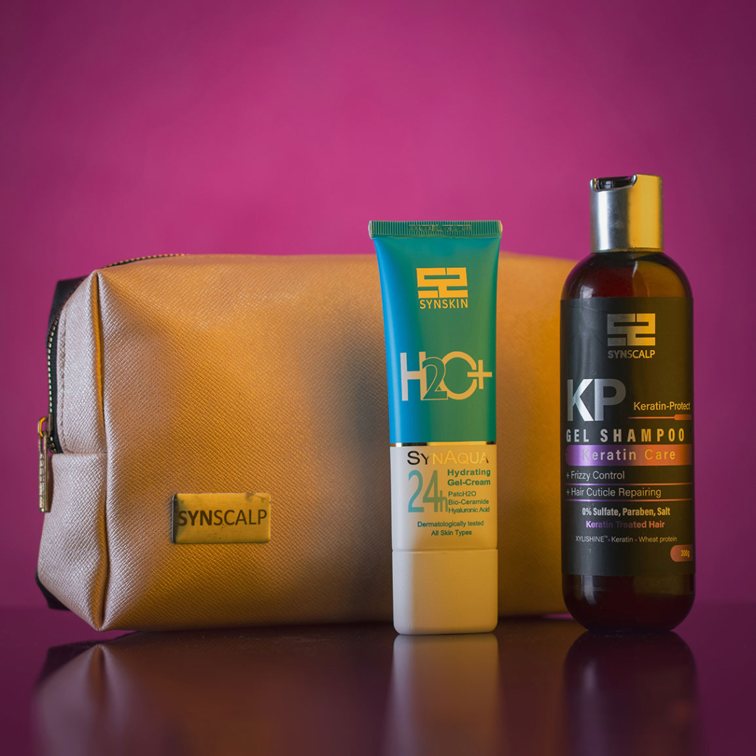 پک کامل مراقبت پوست و مو شامل ژل کرم آبرسان قوی و شامپو مخصوص موهای کراتینه به همراه کیف لوازم آرایش.