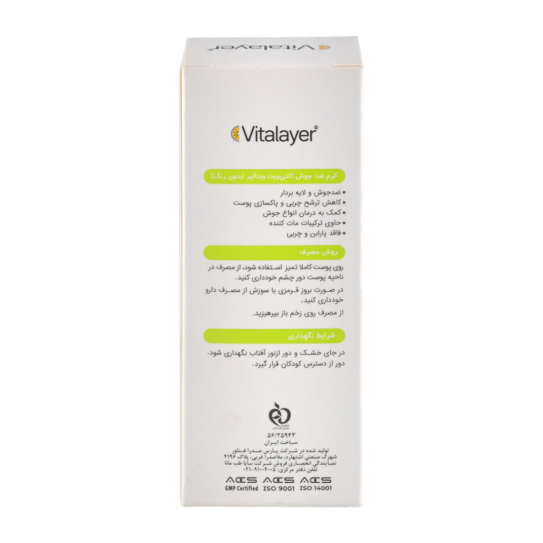 کرم ضد جوش اکتی ویت ویتالیر بی رنگ با فرمولاسیون سبک و موثر برای کنترل چربی و کاهش آکنه مناسب پوست‌های مستعد جوش.